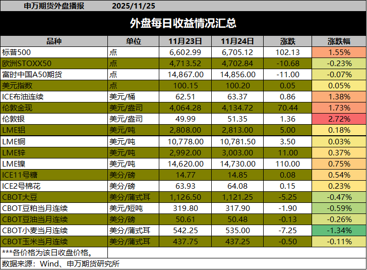 原油:美国对俄石油公司和卢克石油公司的贸易制裁生效;而卢克石油公司则必须在12月13日之前卖掉其庞大的国际资产组合。乌克兰总统办公室宣布,总统泽连斯基已正式收到美方提交的俄乌冲突和平计划草案。据悉,泽连斯基预计近日将与特朗普总统通电话,就现有外交可能性及实现和平的核心要素展开详细磋商。美联储10月份政策会议纪要显示,美联储决策层在上月降息时存在分歧。尽管政策制定者警告降息可能影响抑制通胀的努力,即过去四年半来美国通胀率持续高于2%的控制目标,但最终仍决定下调利率。整体向下趋势难改。
